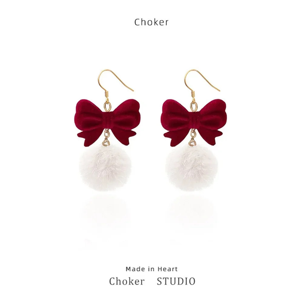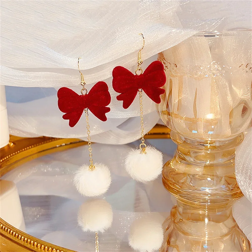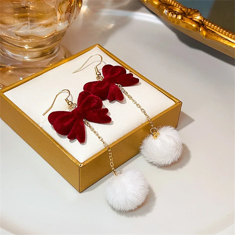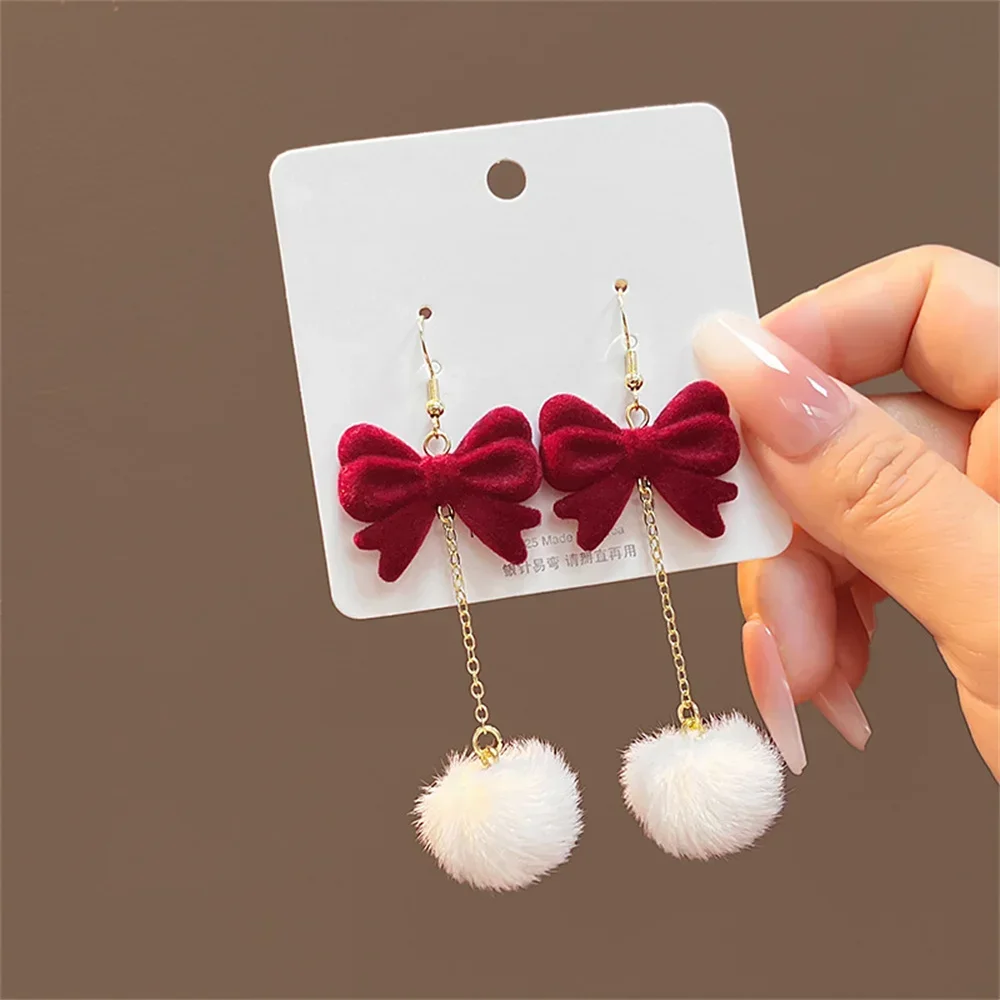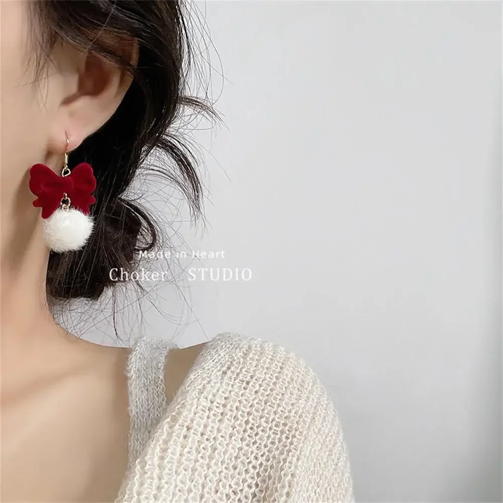 Vintage vermelho novo natal flocagem brincos para mulheres arco-nó c-forma pérola strass gota brinco jóias presente de festa 2024